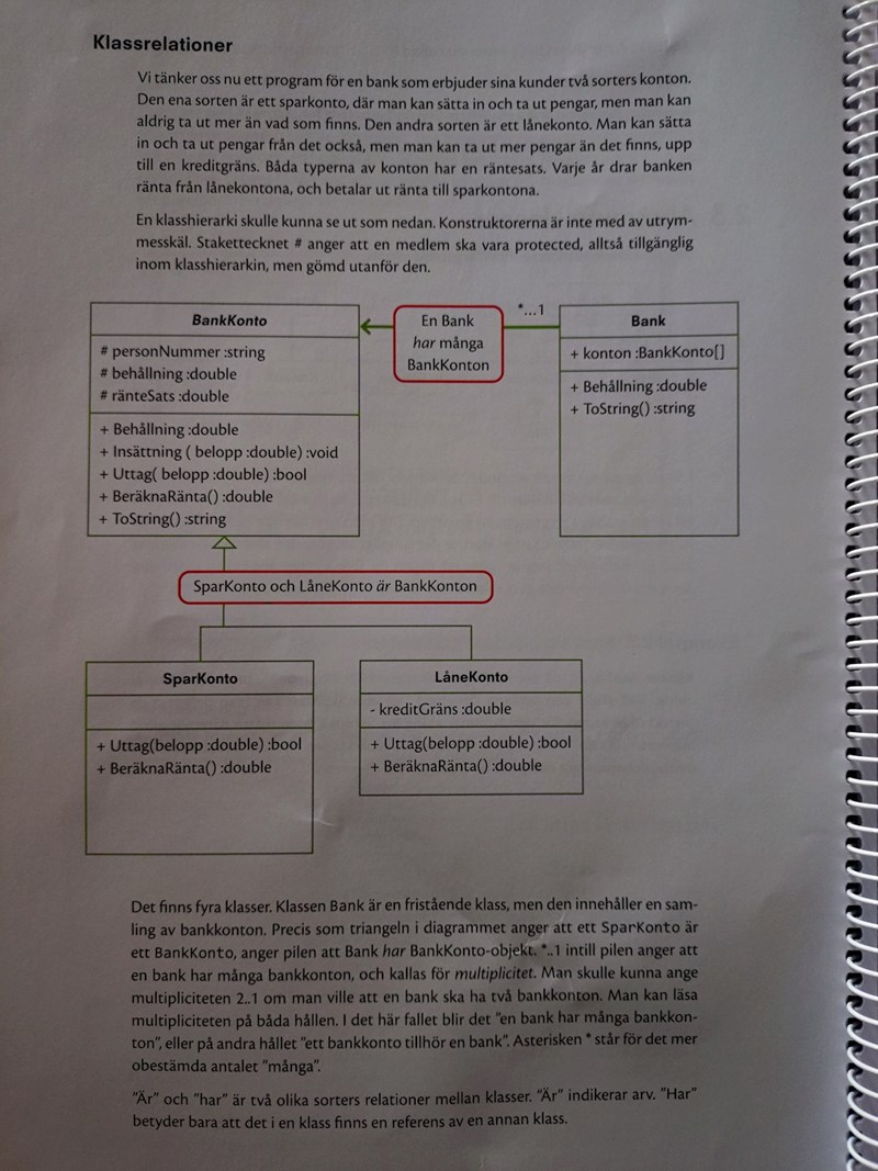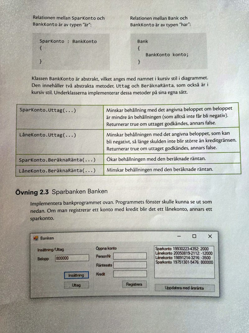 Av diagrammet att döma förväntas banken inte ha någon metod Ränta(), så den kan du ta bort. Den saknar dock ToString(). Där skulle du kunna nämna hur många konton banken har.