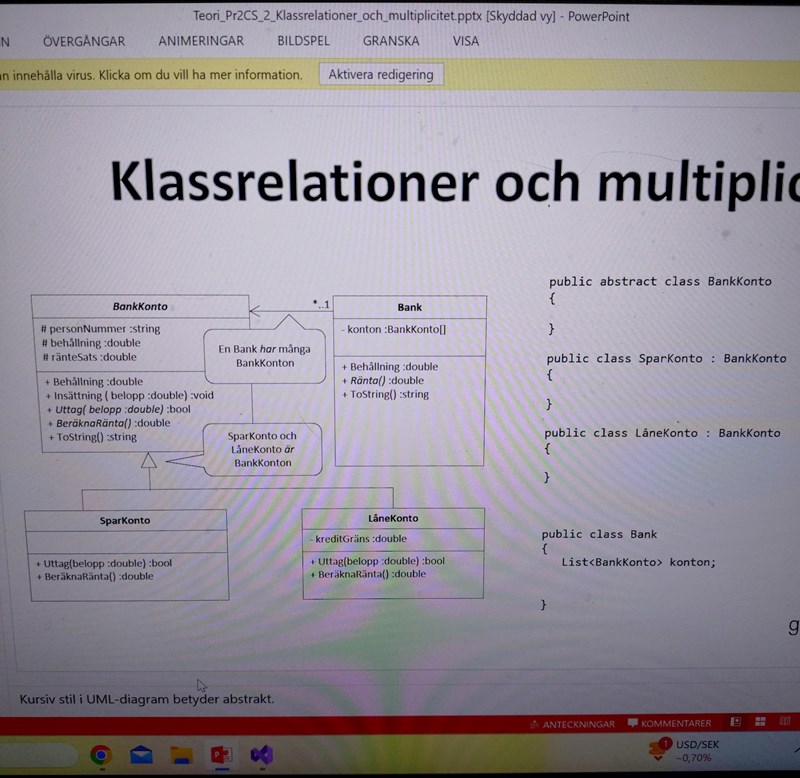 Tack för svar, nä, enligt boken förväntas inte banken ha någon ränta, men enligt skoluppgiften förväntas väl det? Då ska jag lägga till en ToString på banken. Vad kan det tänkas stå i Ränta()? Tänker att all beräkning görs ju i beräkna ränta? Insåg att jag gjort ett fel o satt en kredit med stort k, men det borde ju inte påverka sparkontot? Är det bara ett konto eller alla sparkonton som beter sig så? Vad skulle detta kunna bero på? Sorry för alla frågor, men försöker verkligen förstå o det går sådär 😅