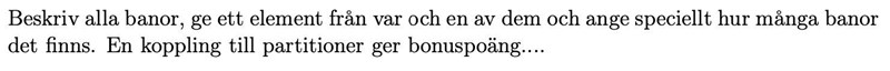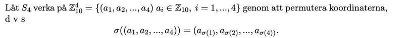 Sedan kan vi titta på banan till ett element (a, a, a, b) där a inte är lika med b. Den består av alla element som har tre koordinater a och en b. Det finns 10 · 9 = 90 sådana banor.
