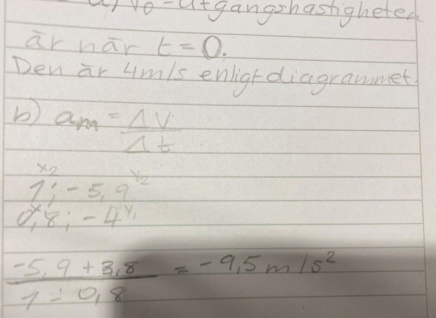 "Den första sekunden" är från t = 0 till ti = 1 sekund. Vilken är hastigheten när t = 0? Vilken är hastigheten när t = 1? Vilken är hastighetsändringen? Är ändringen positiv eller negativ?