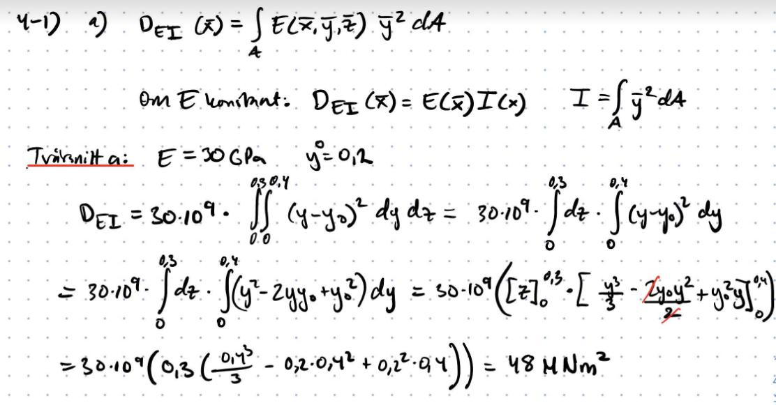 Har problem med 4-1 a) har bestämt det första tvärsnittets styvhet, bifogar lösningen. Men får inte till det för de 2 andra tvärsnitten. Har gjort ett försök för 3e men får det inte till rätt svar.