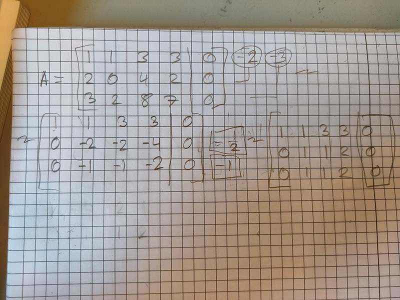Notera först att den andra och den tredje raden i din matris är lika, så du kan eliminera ett steg till och sätta sista raden till 0.