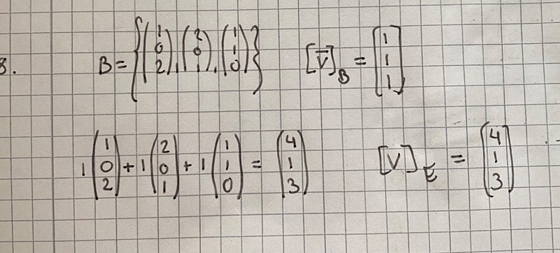 Uppgiften var att göra om vektorn (1;1;1) som var i basen B till en vektor i basen E. Och då gjorde jag som på bilden: