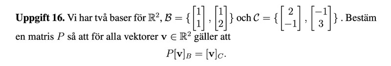 Jag har sett hur man tar fram basbytesmatrisen från standardbasen till en annan bas samt hur man får fram basbytesmatrisen från en bas till standardbasen... men i denhär uppgiften är ju standardbasen inte med... så fattar inte riktigt hur facit har kommit fram till att P ska se ut på det sättet....