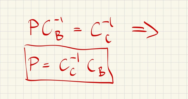 För att transformera en vektor från basen B till basen C kan vi alltså göra det i två steg