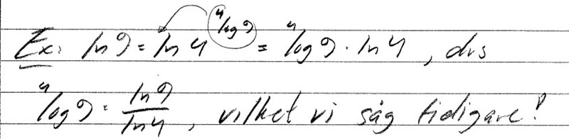 I det här exempet ska man uttrycka ln 9 med hjälp av ln 4. Dock förstår inte det som sker i det andra steget. Med hjälp av ''regeln'' alog ax = x, tolkar jag det som att operationen gör att vi får ut 4log9, men detta är ju inte lika med ln9 som uttrycket hävdar.