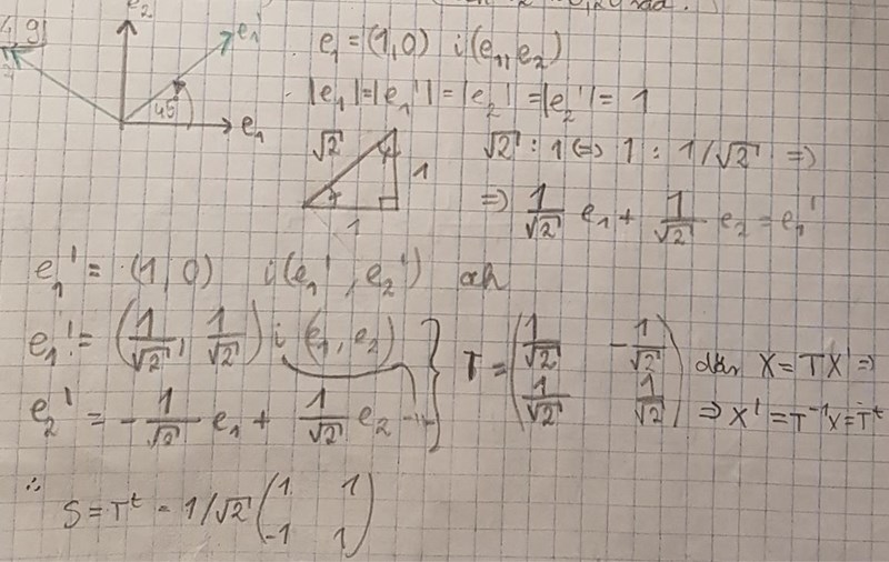 Antag att är en positivt orienterad ON-bas i planet. Inför en ny bas genom att vrida och vinkeln moturs. Bestäm den 2x2-matris S för vilken X' = SX där X och X' är koordinat matriserna för samma vektor i resp. .