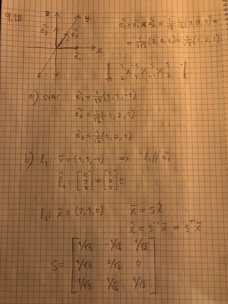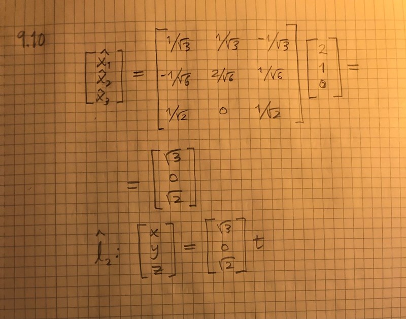 Jag sätter direkt att ehatt_1 är riktningsvektorn för linjen L_1. Sen behöver jag en vektor ehatt_2 som är ortogonal mot linjen L_2 och samtidigt mot ehatt_1. Jag tänker mig att ehatt_1 har ett plan av ortogonala vektorer i origo och tar fram en ekvation för planet genom att ehatt_1 är normalvektor. Likaså för L_2. Korsningen mellan dessa två ekvationer är de vektorer som är ortogonala mot båda, så jag löser systemet och får fram en linje L_3. Därefter kan jag sätta ehatt_2 till riktningsvektorn.