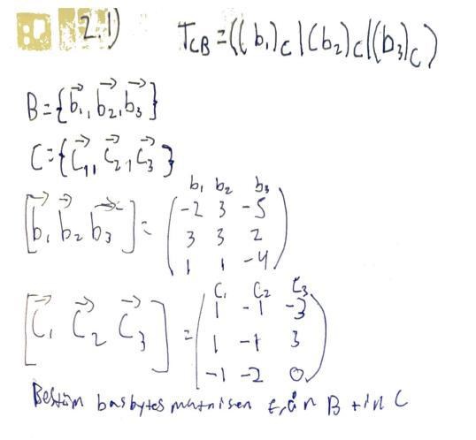 Alltså är matrisen som tar en vektor i b-basen till i c-basen , där består av och C består av