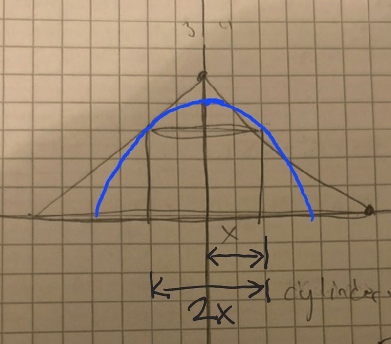 Hej, jag undrar varför jag ska räkna basen som 2x och inte bara x, är det för att y-axeln går mitt genom rektangeln eller? Fråga 3215 inb.