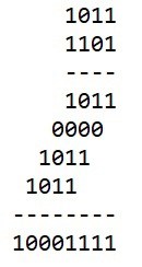 1011 och 1101 är binärt skrivna tal. Multiplicera dem! Kontrollera resultatet genom att övergå till basen 10.