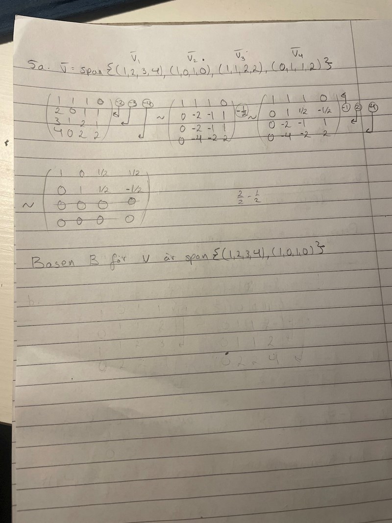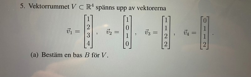 Hej, jag har löst följande uppgift, men får fel svar. Enligt facit ska basen B för V vara v2 och v4, dvs (1,0,1,0) och (0,1,1,2). Men när jag radreducerar min matris får jag att v1 och v2 är oberoende vektorer och utgör således basen B. Varför säger facit något annat?