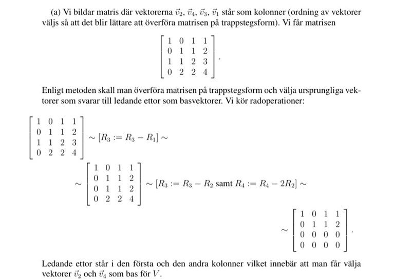 detta är facits lösning, de har valt att stapla vektorerna till en matris i en annan ordning än vad jag gjort, och därmed får de ett annorlunda svar. Min fråga är: spelar det roll vilken ordning man lägger upp vektorerna i en matris? Kommer det påverka vilken som är linjärt beroende eller inte?