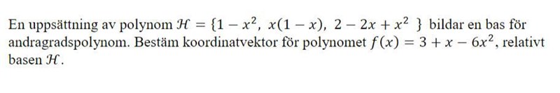 Ekvationen du har skrivit och vill lösa är "vilken linjär komb av Hger vektorn (3,1,-6)", men (3,1,-6) är ju skriven med basen B som PATENTERAMERA skrivit. Om du vill ta reda på vilka koordinater på detta sätt måste HL vara skriven i basen H