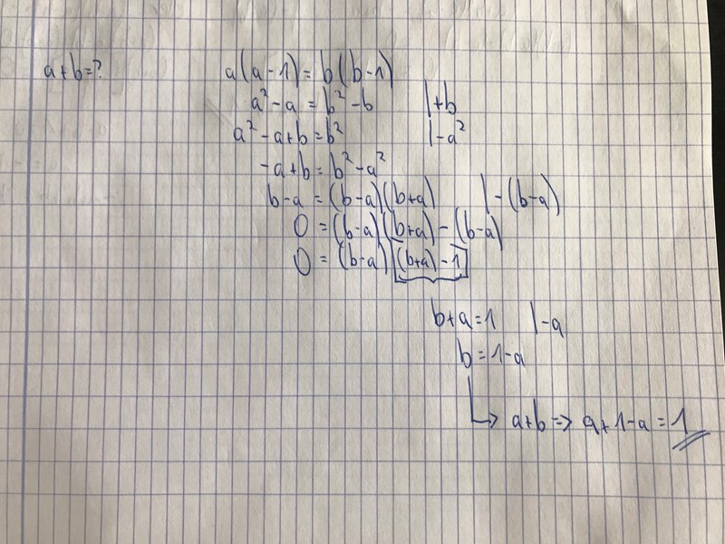 "Bestäm värdet av a + b om du vet att a(a - 1) = b(b - 1).