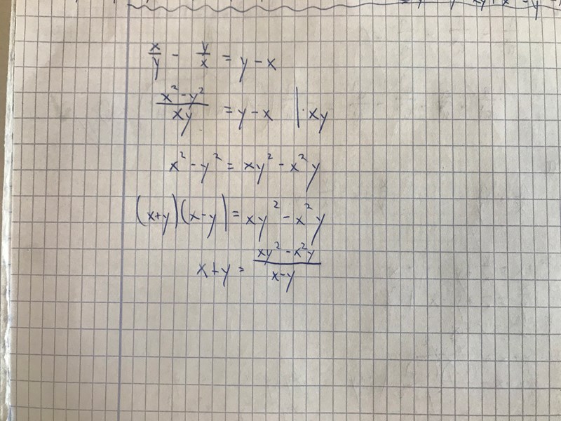 Laguna skrev:Man kan massera det kända sambandet lite och se vad som händer. Om man ordnar så att termerna som liknar varandra hamnar på samma sida så får man först x/y - y/x = y - x. Vänsterledet här kan man skriva på gemensam nämnare. Hur blir det då?