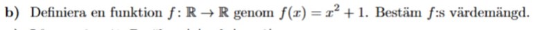 Här förstår jag tänket med att det lägsta värdemängden kan anta är 1 eftersom alla reela tal upphöjt till två alltid kommer vara > 0 så den här funktionen kommer som lägst vara 1 då x=0. Men skulle detta vara ett giltigt svar?