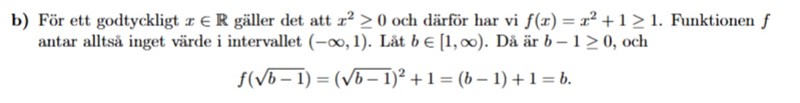 Notera att facit bevisar att varje värde i intervallet y>=1 antas. Det hade varit juste om det hade stått i uppgiften att detta krävs, så jag hålller med föregående inlägg. Man kan annars visa samma sak genom att först påpeka att f är kontinuerlig på hela R och sedan tillämpa satsen att kontinuerliga bilden av en sammanhängande mängd (i detta fall R) är sammanhängande.
