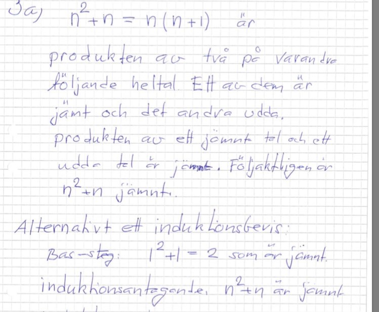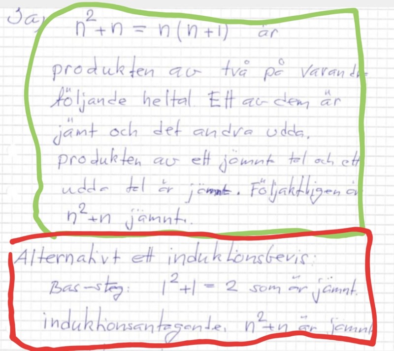 Den första delen (grönmarkerat i bilden nedan) förklarar varför uttrycket n2+nn^2+n är ett jämnt tal. Denna del bör du lägga tid på att verkligen förstå.