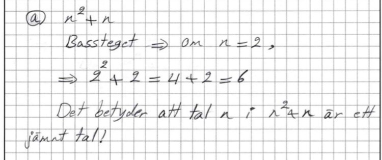 Den andra delen (rödmarkerat i bilden nedan) är en början på något som kallas induktionsbevis. Det är alltså inte en fullständigt bevis och därför ska du inte lägga tid på att försöka förstå den delen. Om hon endast hade skrivit denna del som svar på tentan så skulle hon inte fått full poäng.