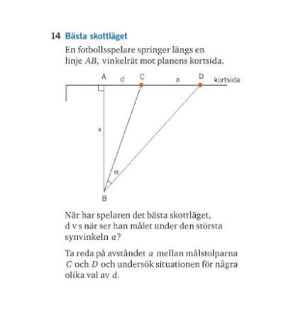 Hej! Jag försöker lösa denna uppgiften, har läst mig fram till att det bästa skottläget ges med högst gradantal, som är vinkel a med 15,15°då d är 20 , men i resultatet har man använt sig utav olika värden på d och skrivit att avståndet 25 på d ger vinkeln 23,9°. Varför står det då att svaret är 15,15° när de tidigare fått fram en större vinkel?