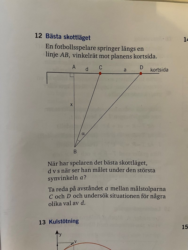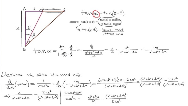 Jag förstår att när B förflyttas uppåt mot A så kommer vinkeln a att förändras tills den når en maximipunkt för vinkeln, men inte hur jag ska tänka för att redovisa vart den punken sitter.