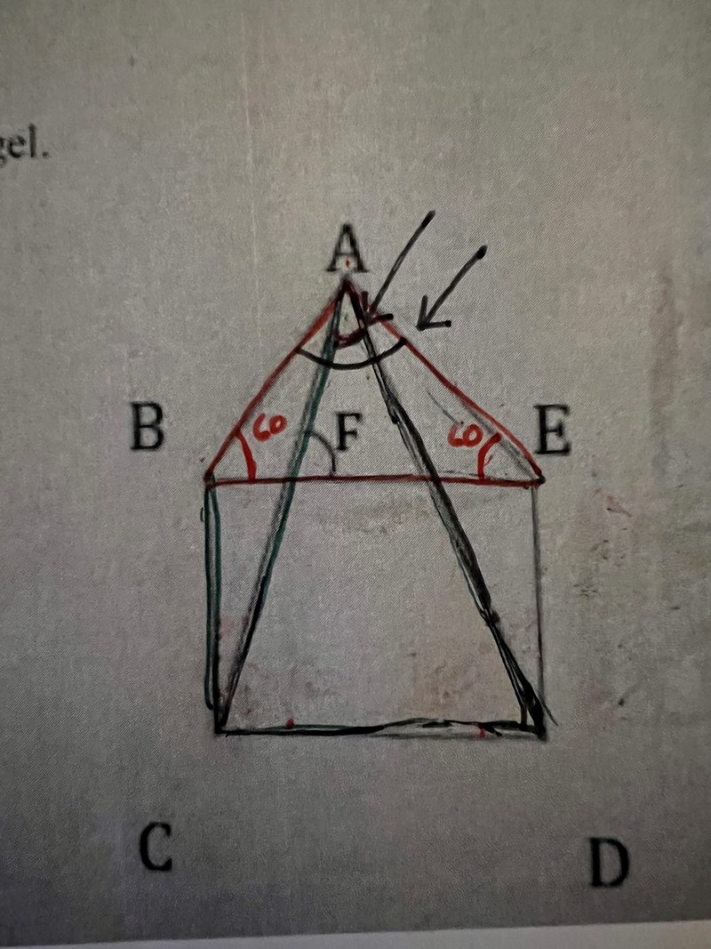 Jag vet ju att ABE är liksidig vilket innebär att dess vinklar är lika stora. Vinkelsumman i en triangel är ju 180 grader och därför vet jag att varje vinkel i ABE är 60 grader. Men därefter är det stopp för mig och jag blir galen. Hur ska jag resonera vidare?