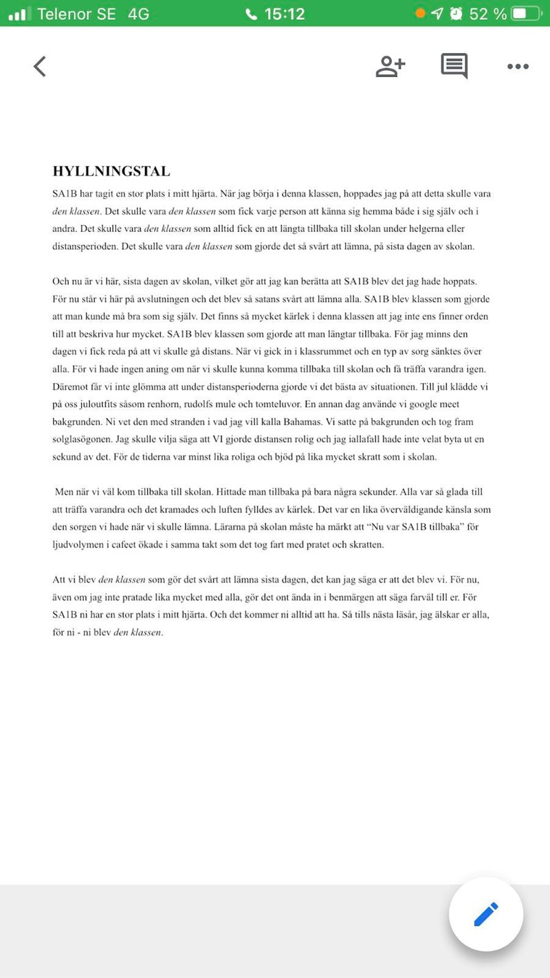 Talet handlar såklart om min klass "SA1B" och detta skrev jag på 20 min ish. Jag tror de bara blir en grund ännu, ifall andra inte tycker annat.