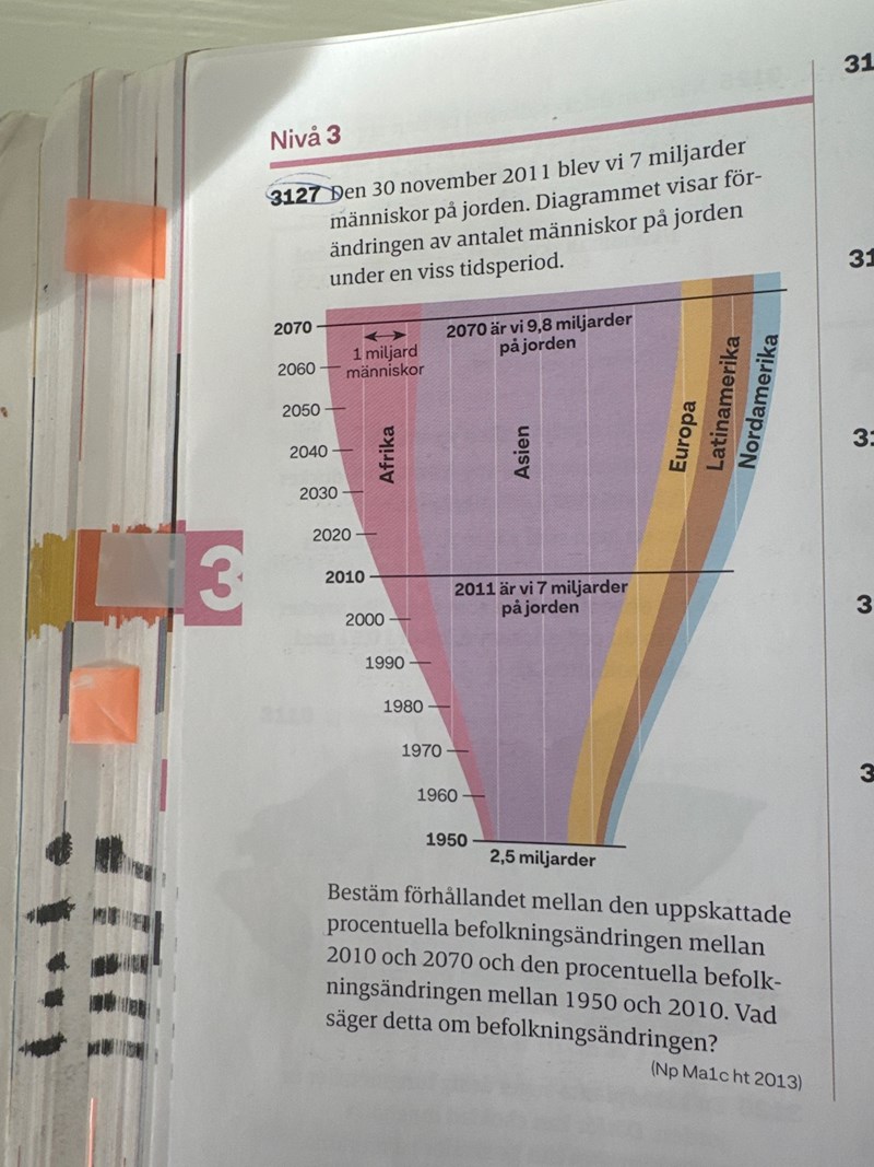 hmm... Det kan ju stå fel i grafen, men i första meningen står det också att vi blev 7 miljarder 2011. I grafen där det står 2010 och är fetstilt står det att vi blev 7 miljarder 2011 igen (där du sa att det kan vara fel på grafen) men i själva frågeställningen återgår de till 2010....