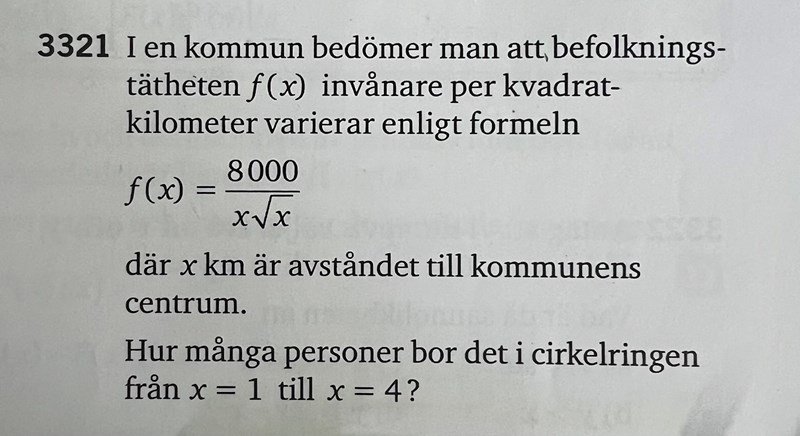 Jag tänkte först att man kunde beräkna arean när x = 4 resp x = 1 och bara subtrahera den ena från den andra, men det går naturligtvis inte då befolkningstätheten varierar med x.