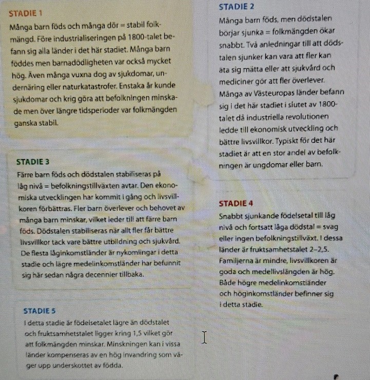 1. Studera den demografiska transitionen på sidorna 62-63. Placera in de tre pyramiderna i rätt stadie. Förklara varför de hör hemma i just det stadiet.