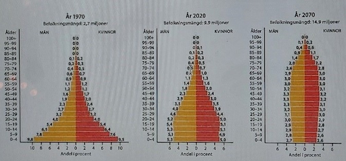 Befolkningens ålderssammansättning är vad de tre befolkningspyramiderna visar, för varje åldersintervall ( skiva) visas hur stor andel av männen resp kvinnorna son har den åldern.