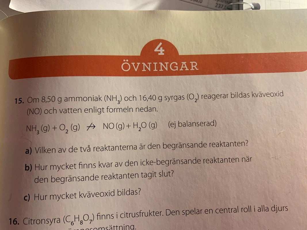 Jag gjorde det och fick att NH3 är 4 mol och O2 är 5 mol