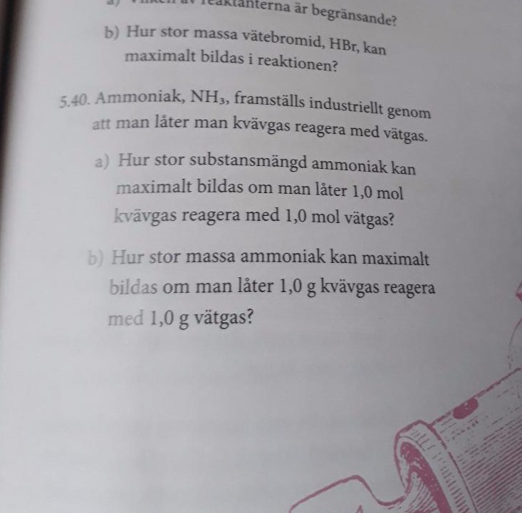Det krävs väl 1/3 av vätgasen för att reaktionen ska bli fullständig eller att kvävgasen isåfall behöver vara 3 ggr så stor, vilket visar på att kvävgasen vid detta fall är begränsad.