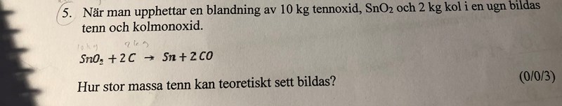 jag tänker att tennoxid är den begränsade massan eftersom jag får den till 66 mol och kol till 166 mol, vad gör jag fel? För tydligen är kol begränsande!