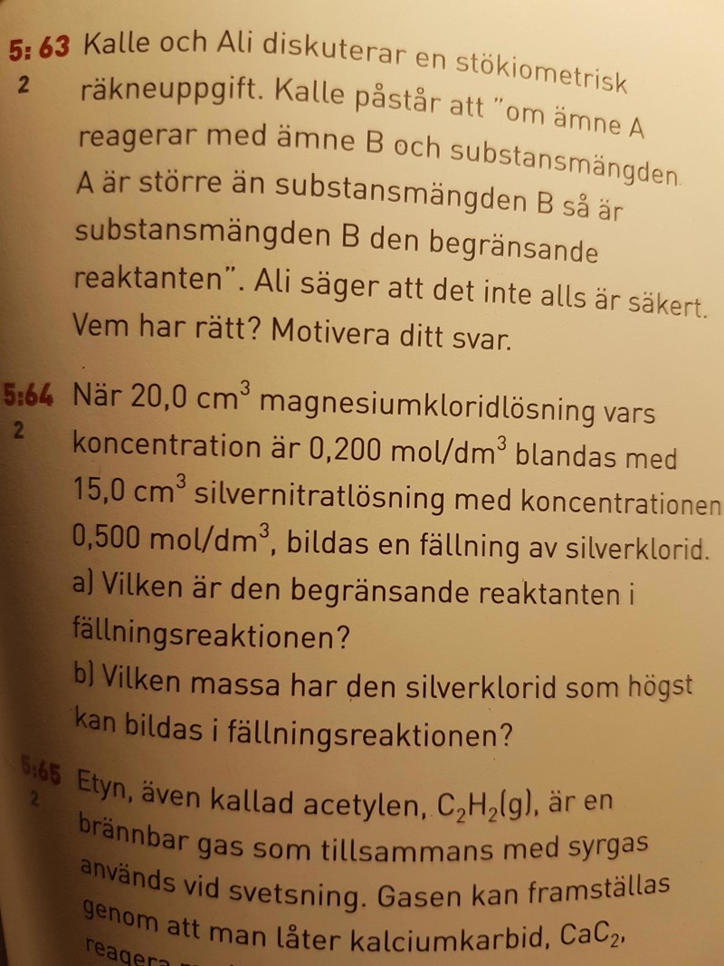 Korrekt. Hur många mol silverjoner är det i 15,0 ml silvernitratlösning med koncentrationen 0,500 mol/dm3? Hur många mol kloridjoner är det i 20,0 ml magnesiumloridlösning med koncentrationen 0,2000 mol/dm3? Vilket tar slut?