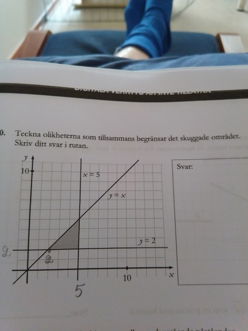 Okej, jag jag beskriver alla punkter som ligger under linjen y=x med olikheten (y mindre än x). Räcker det med att skriva dessa tre olikheter för att begränsa det skuggade området?