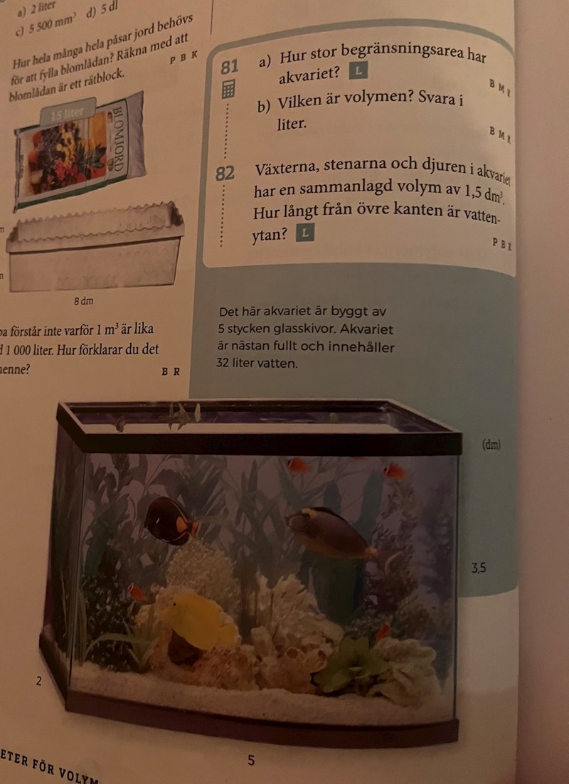 b) Det stämmer att volymen luft högst upp är 1.5 dm3. Men det är inte en volym man frågar efter.