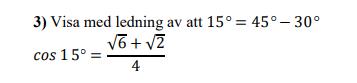 Men jag förstår inte riktigt vad det är de frågar om. Ska jag bevisa att 15 = 45 - 30 är detsamma som cos15 = (sqrt6 + sqrt2)/4 ? Isåfall vet jag hur jag ska lösa uppgiften, men om inte; hur ska uppgiften tolkas?