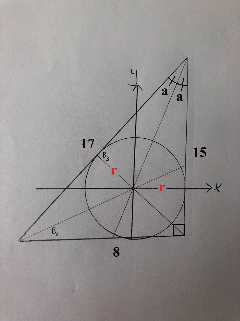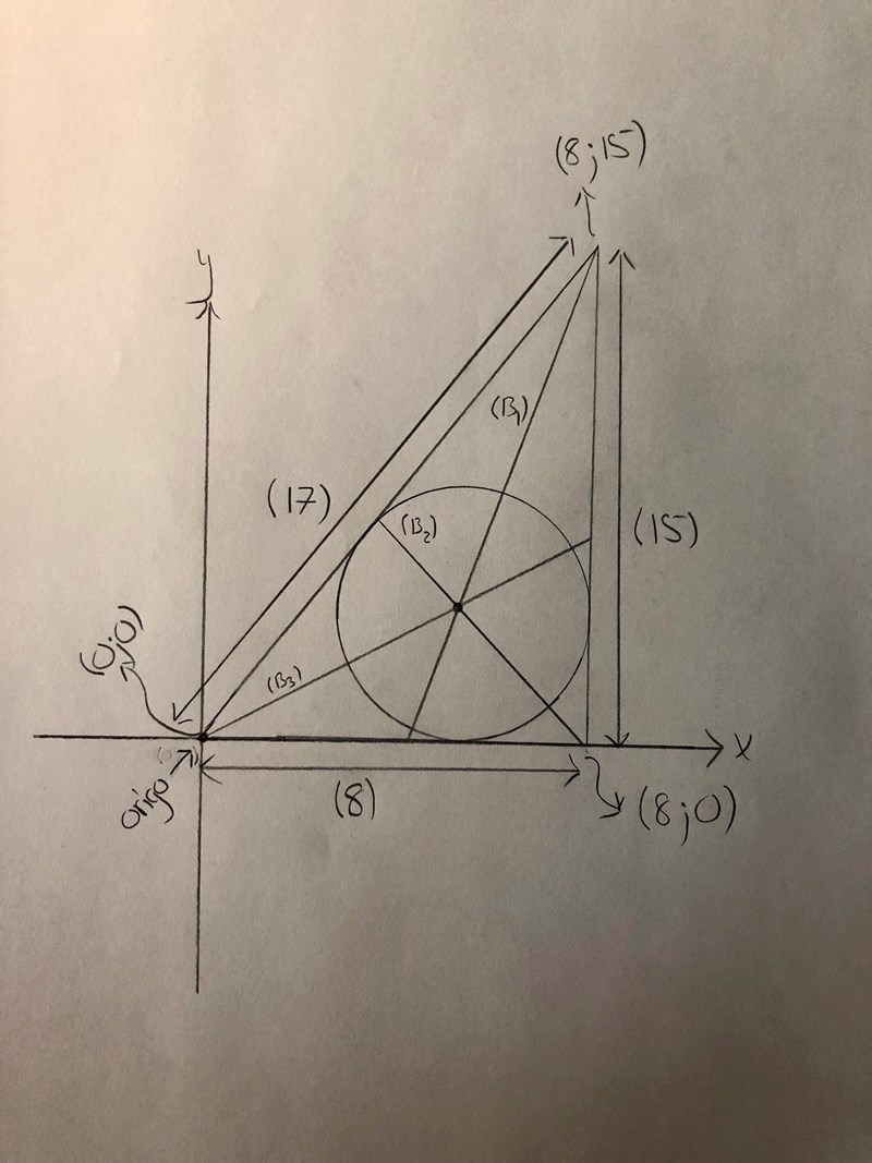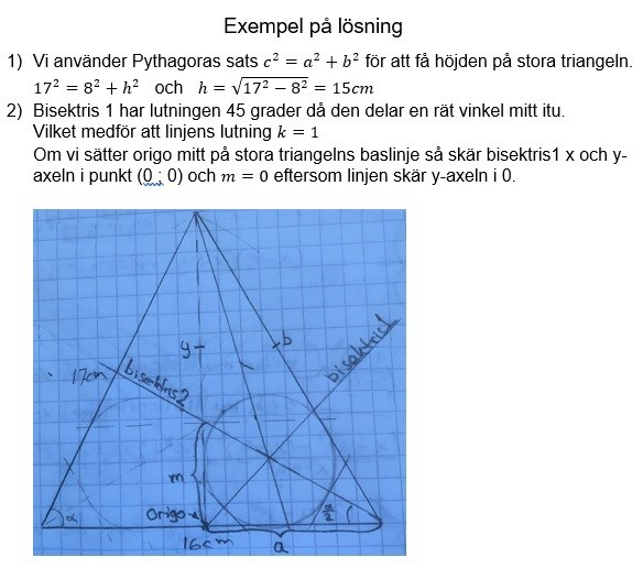 För att följa ConnyN:s metod så har jag ritat 3 bisektriser, en från varje hörn. Jag har ritat in ett koordinatsystem och la mitt origo i cirkelns mittpunkt. Jag postar bilden och hoppas att du kan förklara ifall bilden är rätt ritad eller fel...