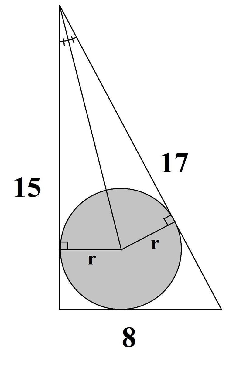 som även den måste vara lika med 60, så vi får r = 3.Samtidigt har vi härlett en formel för den inskrivna cirkelns radie i en godtycklig triangel, r = 2A/p , där A är triangelns area och p (perimeter) dess omkrets. Se figuren i denna inspirerande källa: https://www.mathalino.com/reviewer/derivation-of-formulas/derivation-of-formula-for-radius-of-incircle