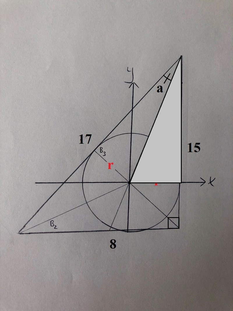 Du gör det verkligen svårt för dig när du placerar origo i cirkelns mitt - då vet du ju inte4 koordinaterna för någon annan punkt. Jag skulle placera origo i hörnet nere till vänster, för då känner jag till koordinaterna för samtliga triangelhörn.