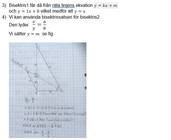 Jag gjorde såhär: Jag tog fram samtliga trigonometriska definitioner och i mitt fall känner jag igen längden på triangelns samtliga sidor. Därav använder jag antingen: cos(v), tan(v) respektive sin(v) beroende på vinkel det handlar om. När jag, med hjälp av en trigonometrisk definition får ut en vinkel så tar jag den vinkeln och dividerar på 2 eftersom bisektrisen delar en vinkel i två lika stora vinklar. När jag delar min kända vinkel på 2 så är väl det också k-värdet för bisektrisen. Stämmer detta?