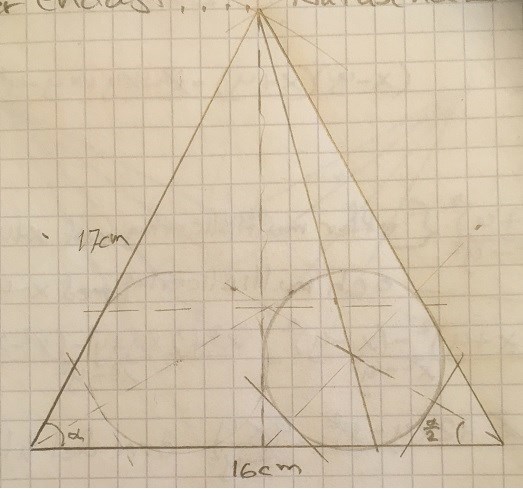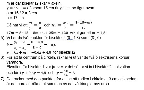 Tack för ditt svar ConnyN. Jag följer din metod men när jag delar upp triangeln i två så undrar jag bara om det är 3 bisektriser som jag ska rita in? Alltså en bisektris från varje hörn i triangeln och på så sätt få ut mittpunkten i cirkeln?