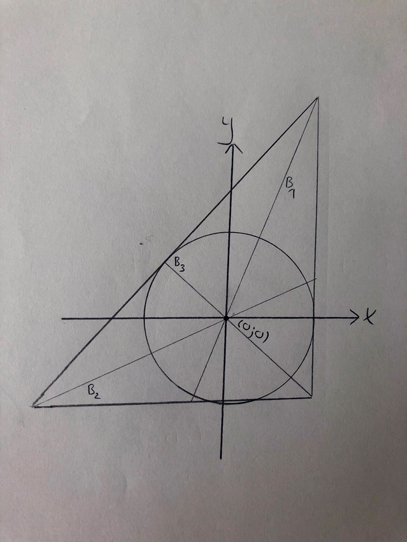 Jag undrar i så fall: Hur kan jag utifrån bilden nedan komma framåt? Jag har ritat tre bisektriser, en från vardera hörn och även ritat in ett koordinatsystem. Jag la mitt origo i cirkelns mittpunkt. Hur går jag vidare härifrån? Vad är nästa lilla steg? Jag vill gärna utgå från bilden nedan för att det är på det sättet jag lär mig allra bäst. Givetvis får andra bilder/ritningar postas här. 👱🏻♀️
