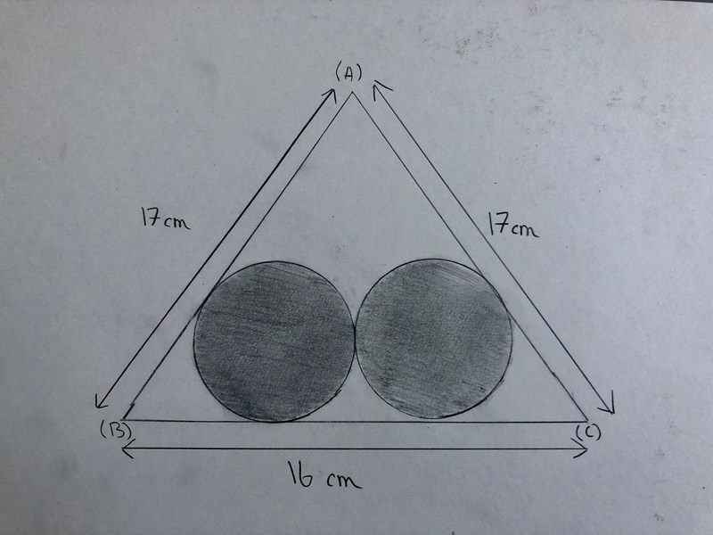 Om vi betraktar halva triangeln och drar vinkelräta linjen från vardera av triangelns kanter till cirkelns medelpunkter uppstår det två par av kongruenta trianglar (det är enkelt att visa med Pythagoras sats eftersom trianglarna är rätvinkliga och två sidor är lika i båda fallen). Börjar man med triangeln som bildas i nedre högra hörnet inser man att dess vågräta katet har längden . Detta ger att avsnittet som ligger på den stora triangelns hypotenusa också har längden . Eftersom hypotenusans totala längd är är längden på det andra segmentet därför .