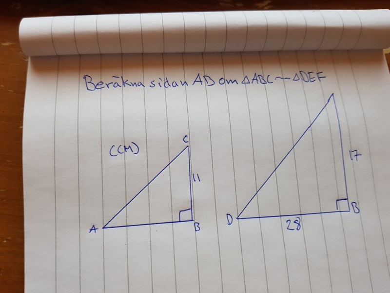 Du har två likformiga trianglar - de är t o m vridna åt samma håll. Det betyder att x28=1117\frac{x}{28}=\frac{11}{17}. Kommer du vidare?