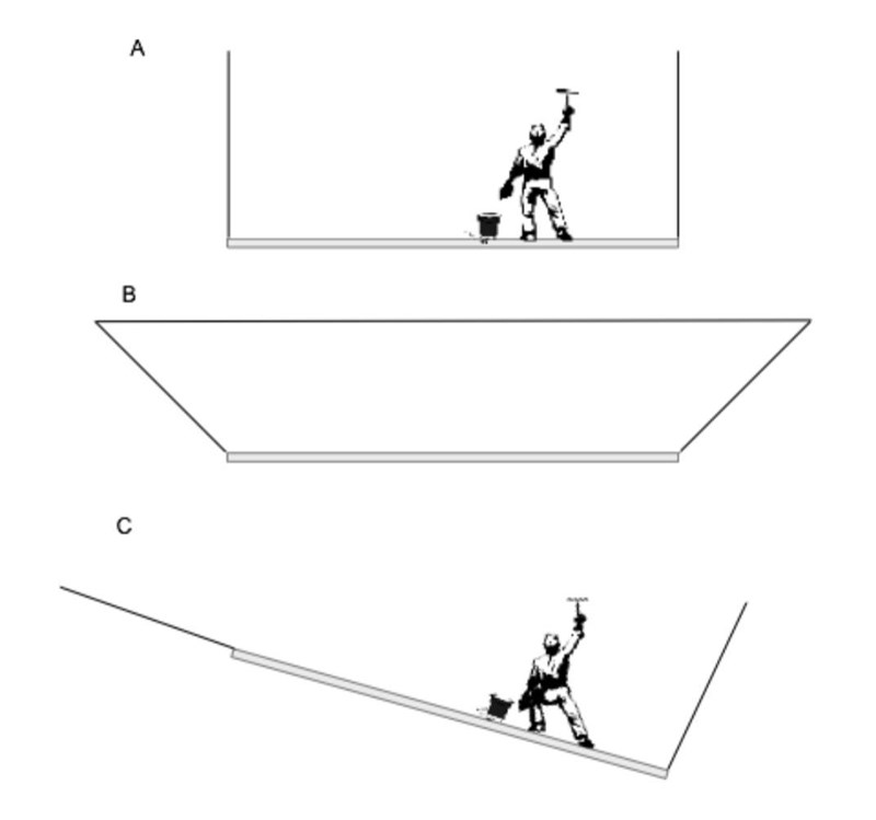 En fönstertvättare står på en aluminiumplattform upphängd i två vertikala rep som i figur A (vi borde kanske ha fyra rep men struntar i den tredje dimensionen här). Plattformen är 6,00 m lång och har massa 30,0 kg, jämt fördelat över längden. Fönstertvättaren har massa 65,0 kg och står precis 2 meter ifrån ställningens högra kant. Frågan är: hur stora är krafterna i de två repen (de är inte samma)? Strunta i hinken på bilden och var fötterna är placerade, dvs anta att hen står i en punkt.