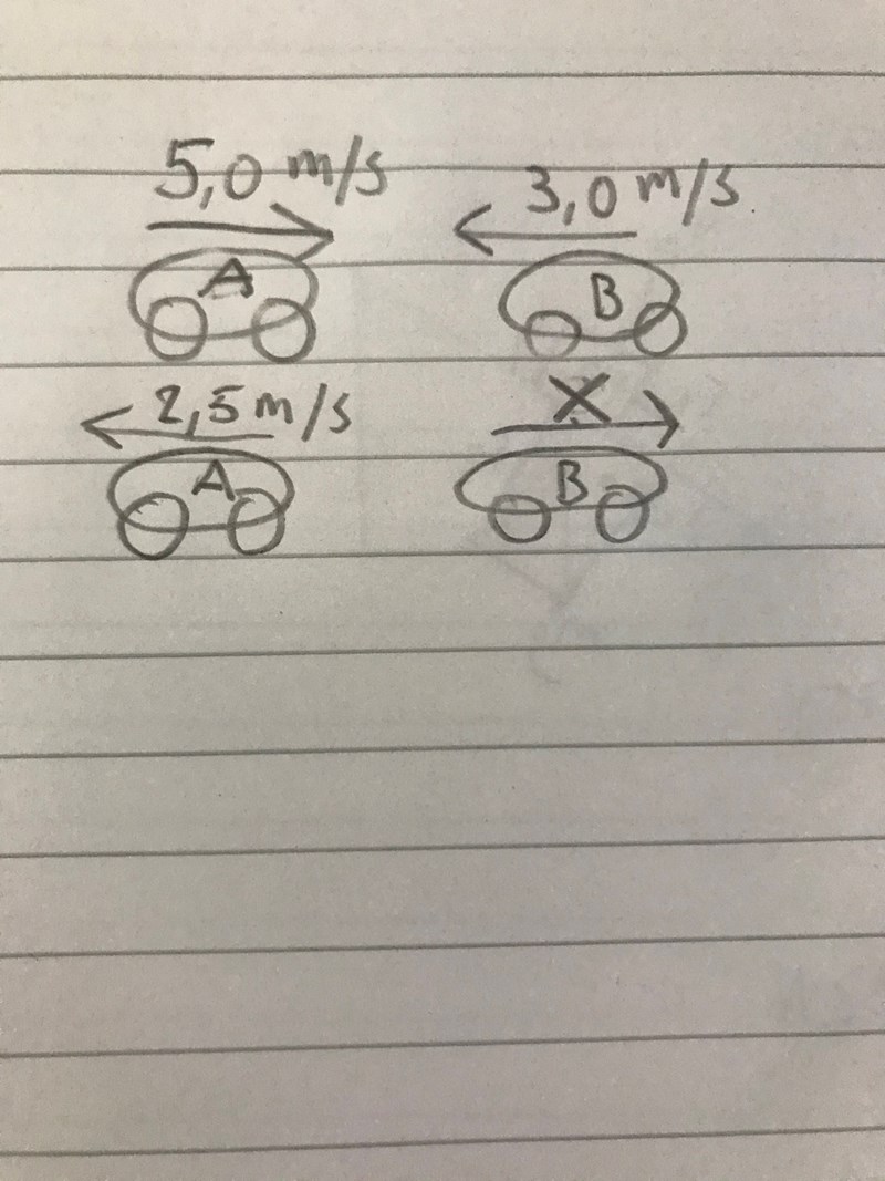 Två vagnar A och B krockar med varandra. Innan kollisionen har vagn Ahastigheten 5,0 m/s åt höger och vagn B hastigheten 3,0 m/s åt vänster.Efter kollisionen har vagn A hastigheten 2,5 m/s åt vänster. Bestämhastigheten på vagn B, om vagn A har massan 2,0 kg och vagn B harmassan 3,5 kg.