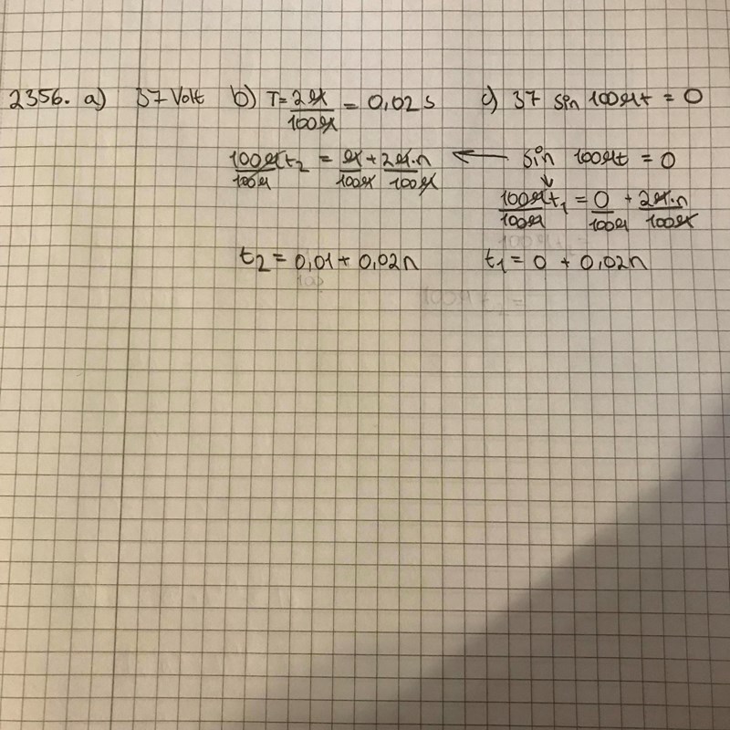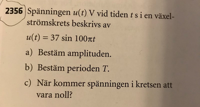 Du har bestämt perioden till 0,02 sekunder, det innebär att på 0,02 sekunder går spänningen från 0, till 37 till 0 till -37 till 0, Två gånger per period är alltså spänningen 0, Så var 0,01 sekund. prova med att sätta in t =0,01, 0,02 osv i funktionen så ser du det direkt. (sin = 0 för argumentet 0, pi, 2pi, 3pi...)